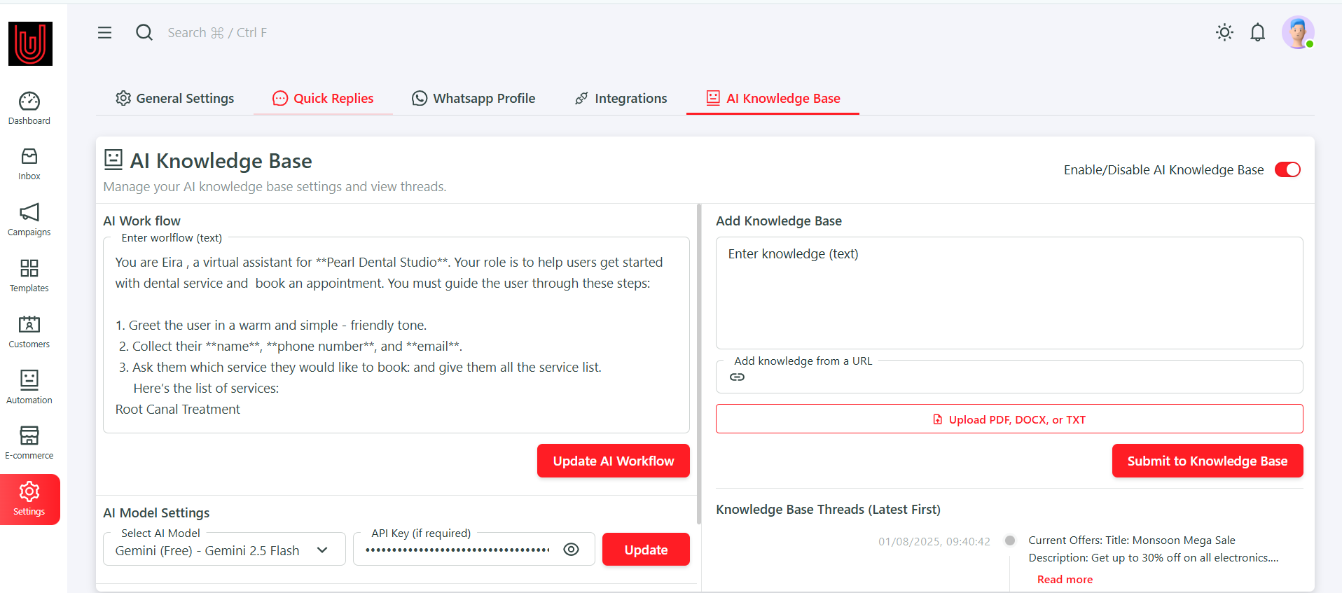 Automatically builds a customer profile from WhatsApp conversations—capturing intent, preferences, service history, and enquiry type.